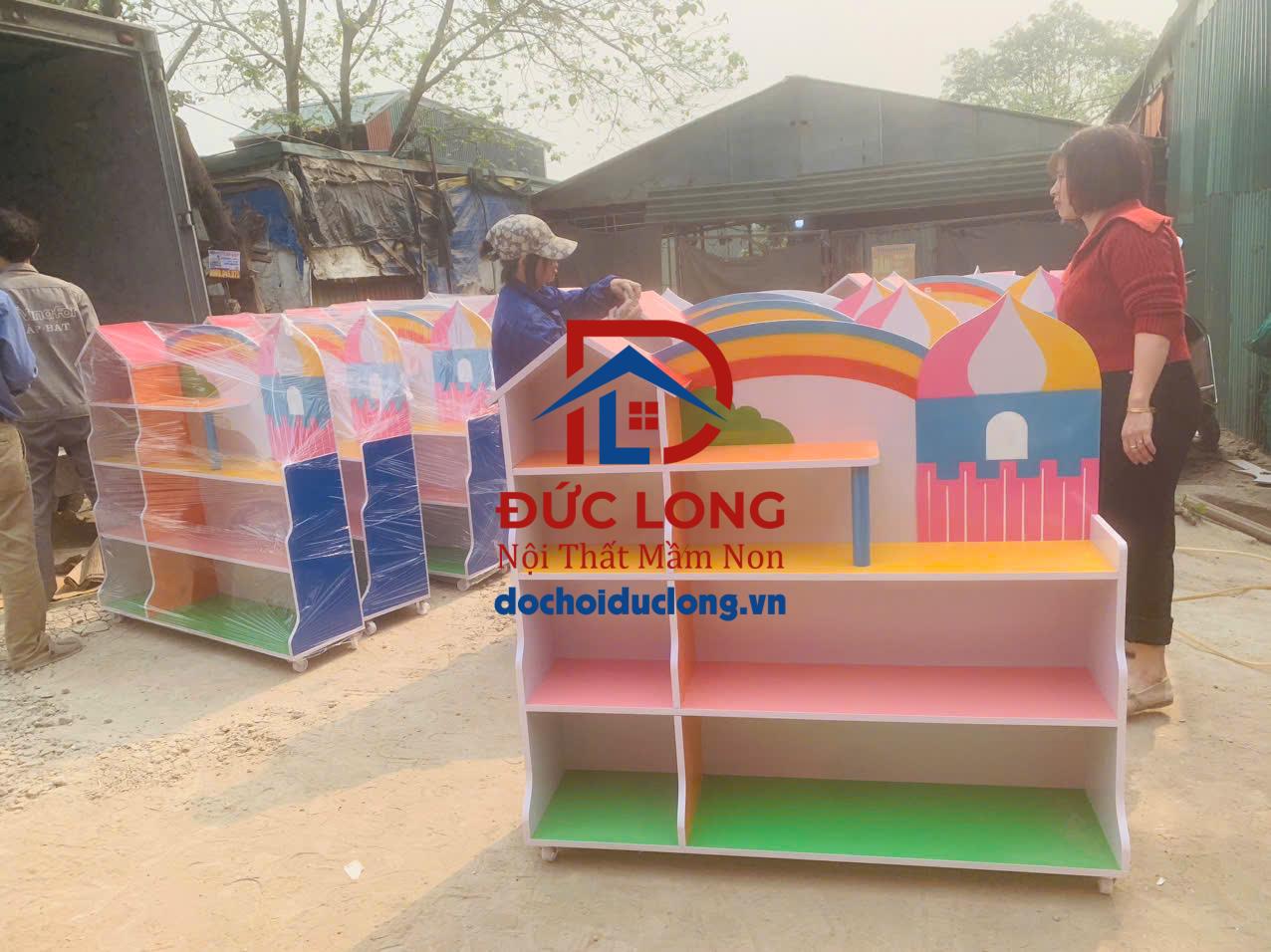 Màu sắc rực rỡ, sơn an toàn, ván gỗ MDF công nghiệp dày dặn chắc chắn, bề mặt mịn, hàng chắc nặng kết cấu vững chãi. Có bánh xe di chuyển